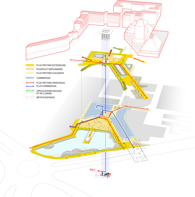 Requalification des espaces publics en périphérie du périmètre d'étude. Démolition partielle de l'esplanade de la commune de Paris, qui permet la création d'une place urbaine et paysagée à ciel ouvert. Développer en périphérie de cette nouvelle place une offre de commerces de proximité et de passage. Restructurer et paysager la partie supérieure de la dalle en préservant les liaisons fonctionnelles existantes. Requalification des abords de la sortie du RER. Mise en valeur des espaces publics et paysagé, notamment les bassins.